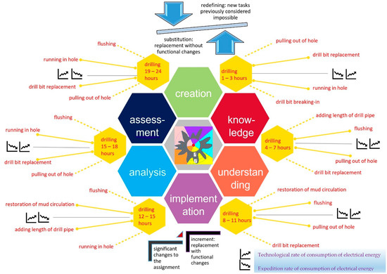 Drilling operations in a well can be assessed using the diagram we developed. It can also be used to control the drilling team and how it follows the parameters of the drilling mode in technological and expedition rates of energy consumption (Table 1, Equations (1)–(16)).The diagram (Figure 4) is presented as a circle with circles inside. Each operation is confirmed by the data of manometers, pressure sensors, drilling fluid flow meters, and tachometers included in the system of ground control of the drilling process. The outer circle is divided into 24 parts, which correspond to hours of a day, and they are divided into 4 parts that correspond to 15 min. Other circles can be placed inside of each circle according to the data from sensors. If the line on the diagram runs parallel to one of the circles, it means that the drilling process is going under constant weight on bit, and energy consumption is stable. If the line runs parallel to the radial line, it is indicative of a sudden energy surge, which can happen during running the drill string into the hole using a rotary table or drill string straining in the case of sticking, etc. The diagram of the process of pulling the drill string out of the hole is opposite to a pattern of running in the hole. If the axial load stays constant during drilling, there are no energy surges, and technological rates of electrical energy consumption remain the same. If there are fluctuations in axial load on the bottom-hole, sensors show waves or jerks, which cause increased consumption of electrical energy. The inner circle demonstrates selection criteria: creation, knowledge/understanding, implementation, analysis, and assessment, which help to control drilling mode parameters automatically with telemetry. Applications, which can be used at analysis level, should contribute to the development of skills to distinguish essential aspects from non-essential aspects, highlight parts, and determine the relationship and structure of the content of technological drilling operations. Implementation allows quick adaptation to unknown situations and fast decision-making in case of emergencies on the drill site. Assessment helps to evaluate reliability, accuracy, quality, and performance efficiency, and take substantiated decisions. Applications that are used at creation-level should give an opportunity to generate ideas and develop technological processes of well construction in any reservoir conditions.