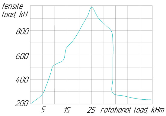 The drilling process consists of the operations shown in Figure 4. During drilling, the pipe string hangs on a hook and lowers as it deepens. Once the bit fires, the entire pipe string is brought to the surface to be replaced. The mass of the entire structure in weight reaches many hundreds of kilonewtons. When drilling in a rotary way, it is necessary that a rotary motion and a load be transmitted to the destructive tool, providing sufficient pressure on the destructive material. Figure 5 shows the dependence of the load that occurs during drilling. Rotor beds for typical operations are shown in Figure 4.