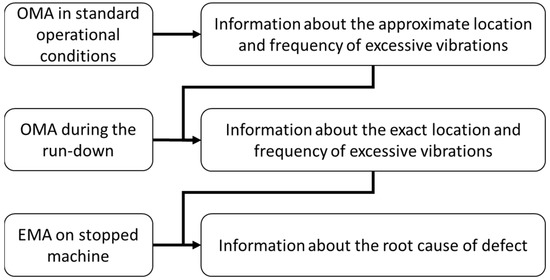 The main idea of the proposed approach is to combine the results from two independent OMA measurements and the EMA measurement to gain a more detailed understanding of the tackled problem. In the first step, classical OMA in standard operational conditions is performed to get an idea of where the problem is located (both in location and frequency). In the second step, OMA during the run-down is conducted, and its results are compared with the results from the first OMA to define precisely where the excessive vibrations are located. Finally, EMA is conducted to get more insight into the structure itself, i.e., when dealing with large machinery impact excitation often fails to excite the vibrations of interest because of low impacting force. This type of behavior suggests non-linearity of the system caused by its complexity, i.e., if the defect is related directly to the impacted structure, it will be appropriately excited. In contrast, if the defect is related to the surrounding elements (e.g., foundation), it will not be excited by the small force of impact excitation. This approach is schematically shown in Figure 1.