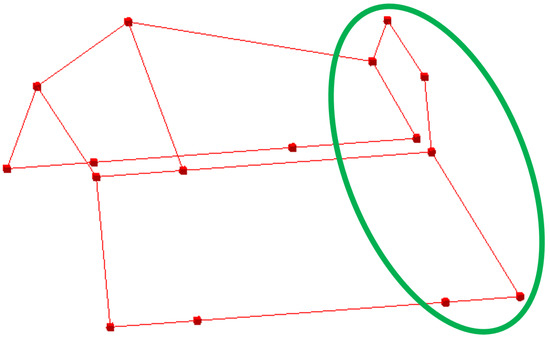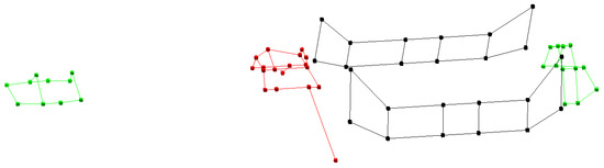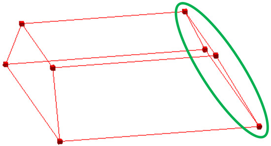 Measurement grid for OMA in standard operational conditions. Green and red components are related to bearing pedestals, while black components are related to the generator casing. Points encircled with green eclipse are related to the bearing with excessive vibration levels.