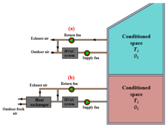 All-water, all-air, and water–air are the three basic configurations of HVAC technologies. All-water-type distributes heat or cool water for the conditioned space using pipes, while, in water–air systems, water and air are both utilized to heat or cool a certain space, whereas the all-air type has gained this terminology in HVAC because the regulation of humidity and temperature is done by air supply only. Figure 1 illustrates the working principle for this HVAC system type [23].