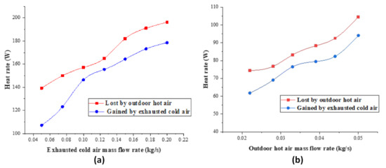 (a) Hot air lost heat rate and cold air gained heat rate in terms of the cold air flow rate (test 1), and (b) hot air lost heat rate and cold air gained heat rate in terms of the hot air flow rate (test 2).