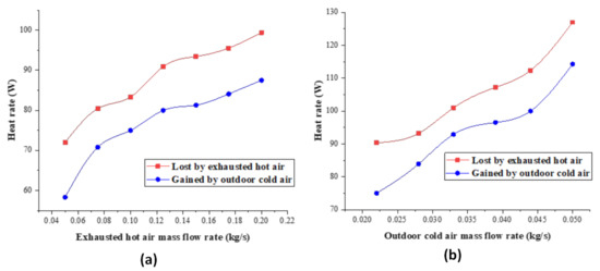 As shown in Figure 3a, with the increase of the exhaust cold air flow rate in the duct, the two heat rates increase. The gained heat by airflow through the heat exchanger is smaller than the lost heat by airflow in the heat exchanger. To illustrate, the heat gain by air flowing through the heat exchanger, as well as the heat lost by airflow in the heat exchanger, increase from 107 W and 139 W to 179 W and 196 W, respectively, when the exhaust cold air flow rate in the duct increases from 0.05 to 0.2 kg/s. This leads to an exchanger average effectiveness of 87%, estimated using Equation (5).