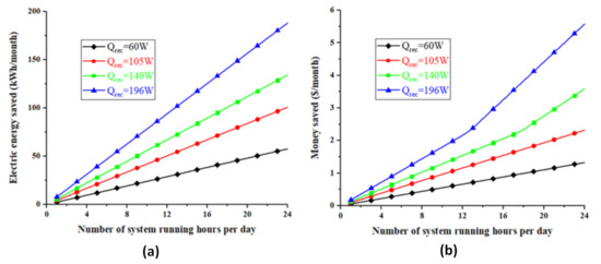 (a) Amount of electric energy saved by the system for different running hours, and (b) amount of money economized by utilizing the recovery system.
