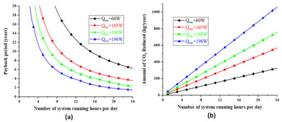 Figure 5a shows that the electric energy saved ranges between 2.4 kWh and 190 kWh per month on the basis of the amount of recovered energy and the system running time (hours). On hot days, and when the system is capable of recovering 196 W, the electric energy saved raises from 8 kWh to 190 kWh when the system runs 2 and 24 h, respectively, while it increases from 2.4 kWh to 58 kWh when the system is able to recover 60 W (on cold days). This means that the system is more cost-effective on hot days compared to cold days and capable of economizing more electric energy, which will directly affect the amount of saved money, payback period, and amount of carbon dioxide gases reduced.