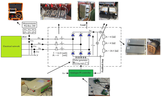 The designed laboratory non-linear load is constituted of a six-pulse thyristor bridge (rectifier) with input reactor (L) at the AC side and resistance at the DC side (the total resistance of the DC side load is up to 36.5 Ω) (Figure 1).