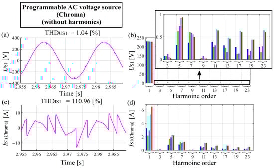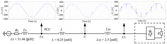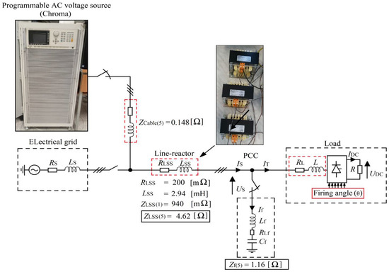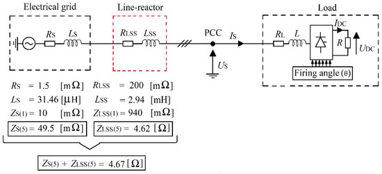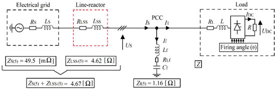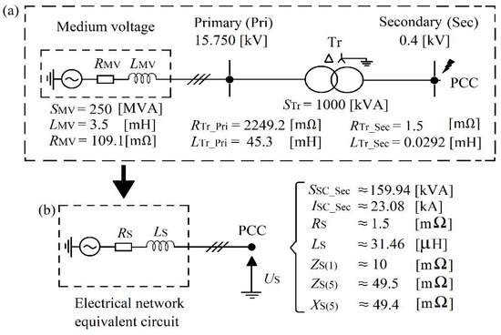 The electrical grid supplying the laboratory in which the experimental studies were performed is shown in the equivalent circuit in Figure 2a. It can be noticed that the parameters of the electrical network are considered from the medium to the low voltage side. The electrical network equivalent parameters for the fundamental and 5th harmonic (impedance (ZS(1), ZS(5)), short-circuit current (ISC_Sec), and power (SSC_Sec)) are presented in Figure 2b.