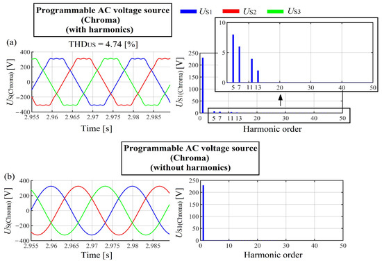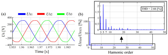 The electrical grid voltage supplying the laboratory setup is symmetrical (the negative sequence represents around 0.12% of the positive sequence) but a bit distorted (Figure 3a) because of other connected non-linear devices. Its spectrum in Figure 3b shows that the dominating harmonics are the 5th (around 2%), the 3rd (more than 1%), and the 7th (almost 1%). According to the IEC61000-2-4 standard [63], its THD and harmonics amplitude are acceptable (Figure 3b).