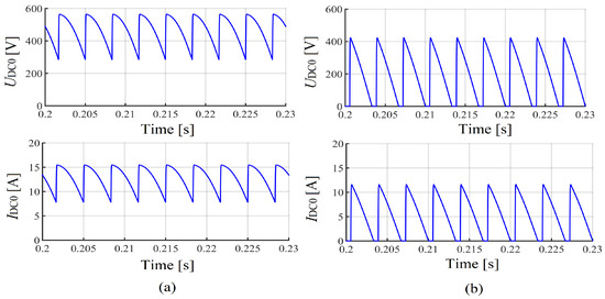 Voltage and current at the rectifier DC side for different firing angle values: (a) continuous mode (θ = 30°); (b) discontinuous mode (θ = 60°) (from simulation).
