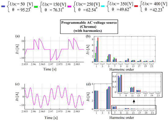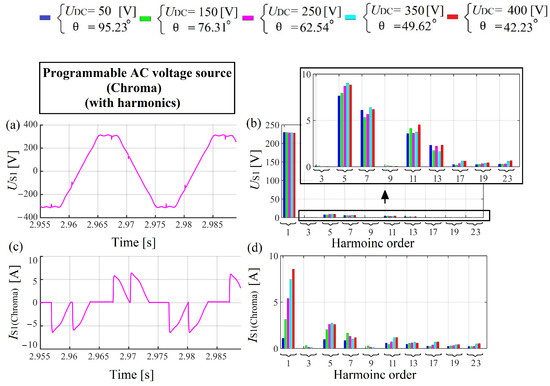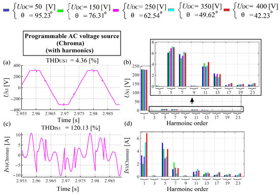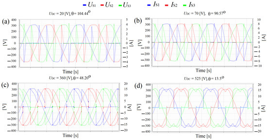 Examples of the measured PCC phase voltage and current for different values of DC voltage and firing angle: (a) UDC = 20 V; (b) UDC = 70 V; (c) UDC = 360 V; (d) UDC = 525 V.