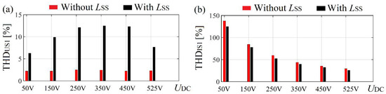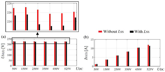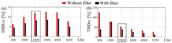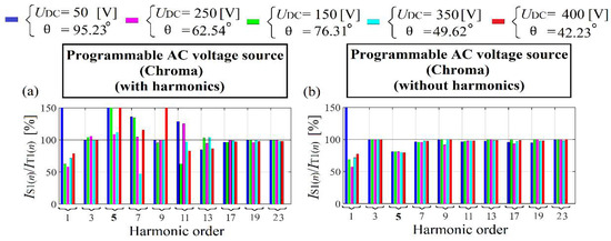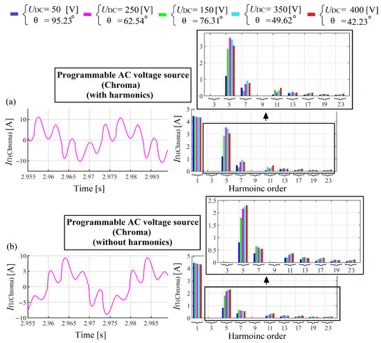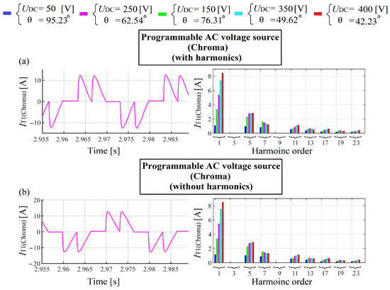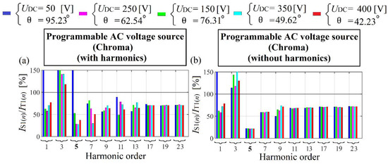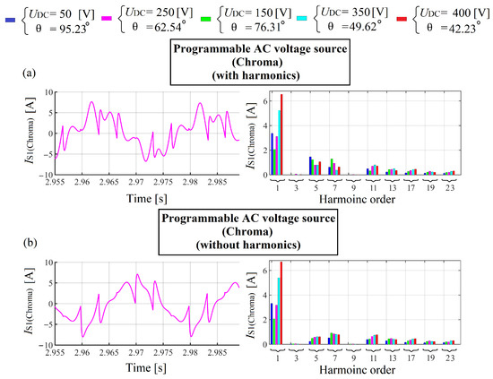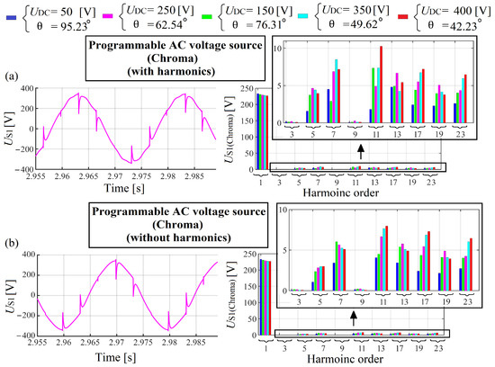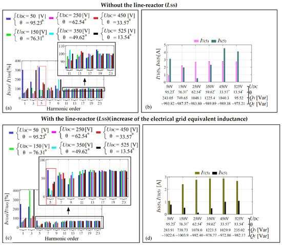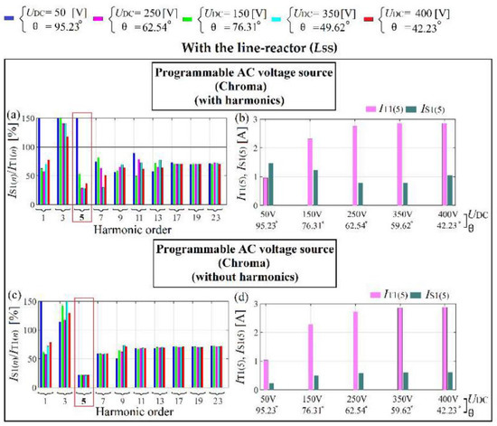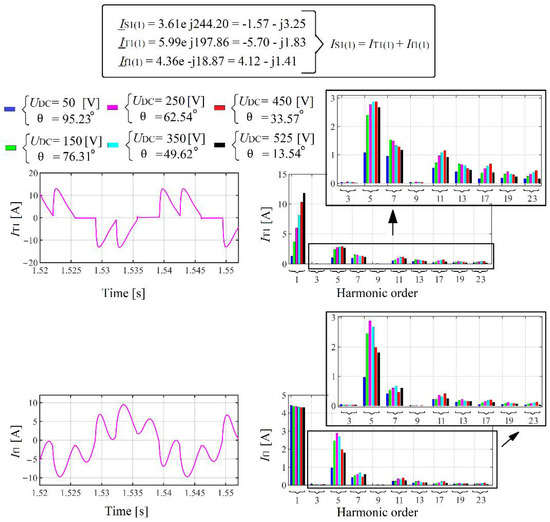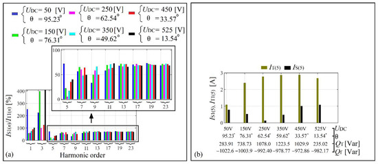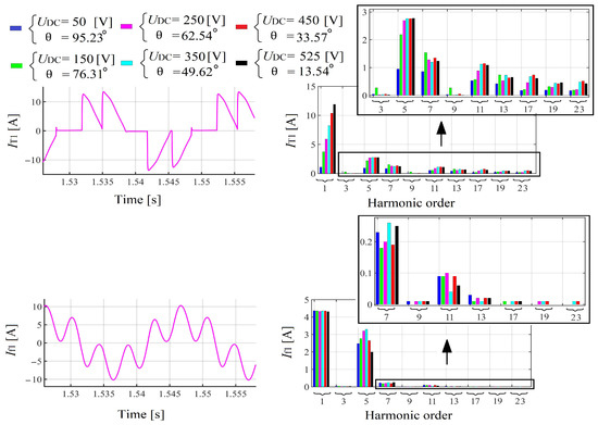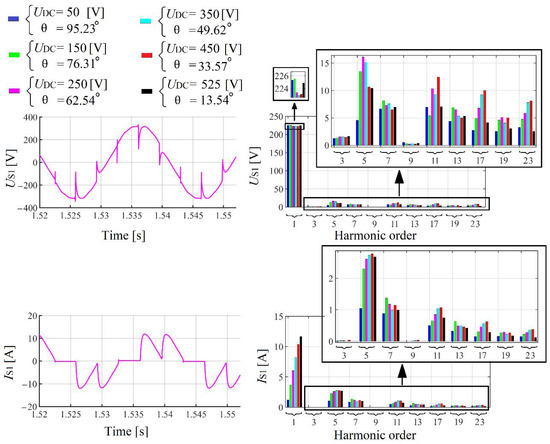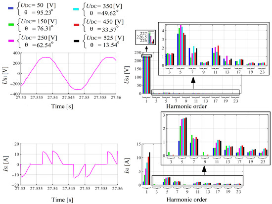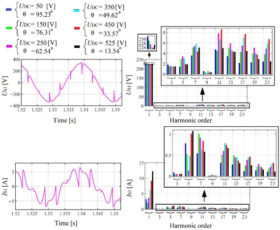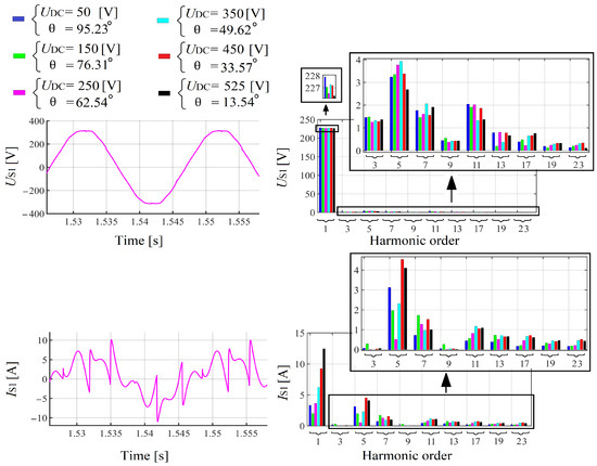 The spectrums in Figure 6 presents the behavior of the amplitude of the grid voltage and current harmonics when the rectifier DC voltage is increased. Concerning the amplitude of the grid voltage fundamental harmonic, it has slightly decreased with the increase in UDC (e.g., from 226.97 V (UDC = 50 V) to 226.13 V (UDC = 525 V)). The 5th harmonic has the highest amplitude for UDC equal to 250 V and the 7th harmonic for UDC to 350 V (Figure 6).