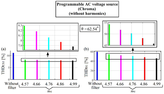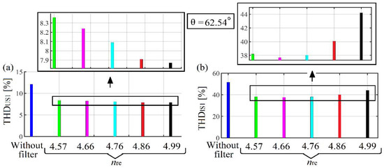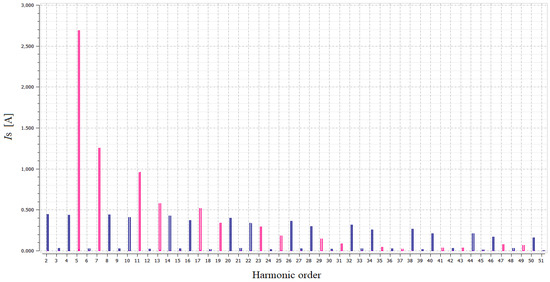 Despite the filter presence in the electrical system, the grid current THD (THDIS1) is higher than the load current THD (THDIT1) (see Table 6). This increase in the grid current THD after the filter connection is due, on the one hand, (depending also on the firing angle value and taking into account the expression (3) used to compute that THD) to the reduction (because of the reactive power compensation) or amplification (because of the overcompensation) of the grid fundamental harmonic, and, on the other hand, to the amplification of some harmonics (e.g., 5th, 7th, etc.) at the electrical grid side (see also the current spectrum in Figure 17 compared to Figure 6).