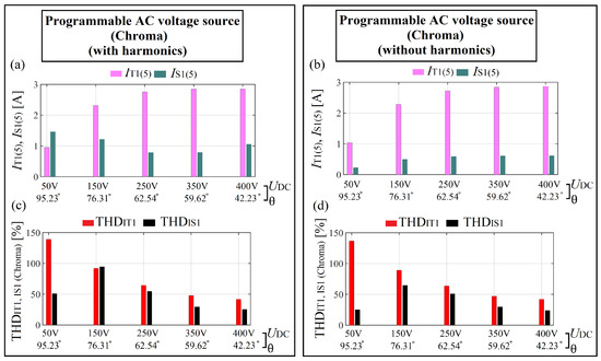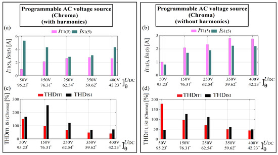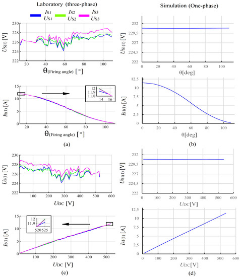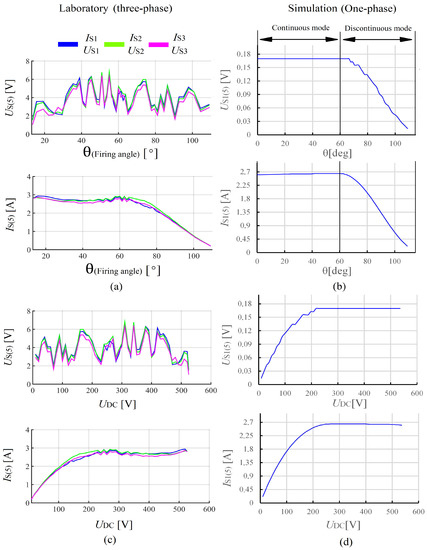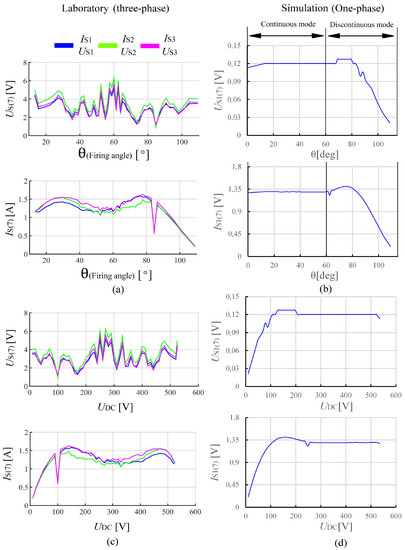 Figure 8a,b represent the voltage and current (fundamental harmonic) versus rectifier firing angle, and Figure 8c,d represent the voltage and current (fundamental harmonic) versus rectifier DC voltage. The difference observed between the simulated grid voltage and the laboratory grid voltage (Figure 8) is due to the fact that in the case of simulation, the supply grid voltage was not distorted (pure sinusoidal waveform before the load connection), whereas, in the case of the laboratory, the supply grid voltage was already distorted before the load connection because of other devices which are continually connected and disconnected (the real electrical grid works continuously).