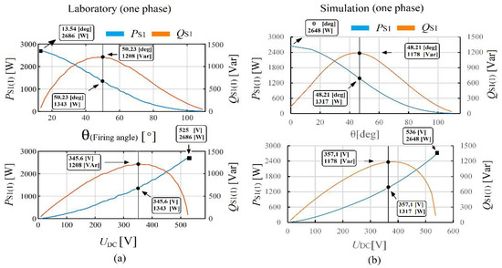 Fundamental harmonic PCC active and reactive powers versus firing angle and versus UDC (one-phase): (a) laboratory data; (b) simulated data.