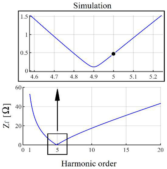 Comparing the 5th harmonic equivalent impedance of the electrical grid (ZS(5) = 49.5 mΩ) to the one of the filters (Zf(5) = 450 mΩ—see Table 1), it can be noticed that the 5th harmonic equivalent impedance of the filter is almost nine times higher than the one of the grid, which allows concluding that the filter will be less efficient on the 5th harmonic mitigation at the grid side. The simulated impedance versus frequency characteristic of the filter is presented in Figure 13.