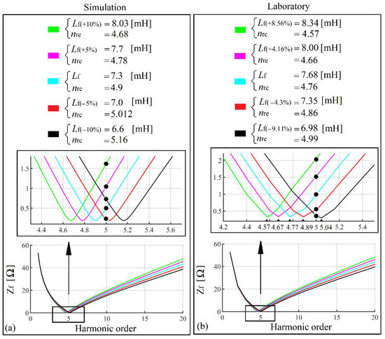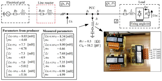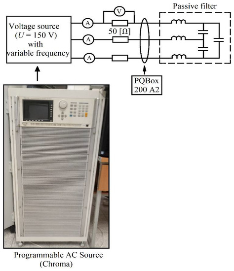 Because of the manufacture tolerance, the parameters of the filter elements were verified in the laboratory using the ammeter–voltmeter–wattmeter method (this method is very common and can be used under any condition in the industries (see Figure A2b in Appendix A). The Equations (A1) and (A2) in Appendix A were used for the computation (see Table 3). The equivalent circuit of the laboratory model in which the filter parameters were verified is presented in Figure A2a (see Appendix A).