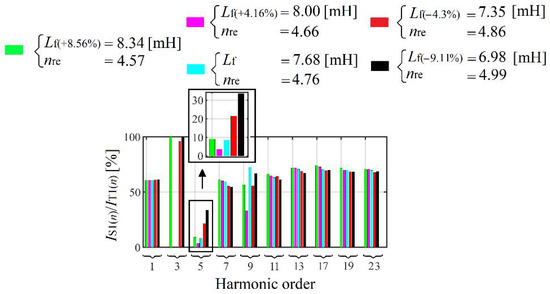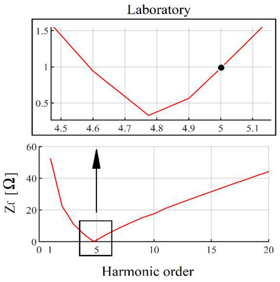 The real parameters (from the laboratory) of the single-tuned filter presented in Table 5 shows that the 5th harmonic equivalent impedance of the filter (Zf(5) = 1160 mΩ, see Table 5) is almost 23 times higher than the one of the electrical grids (ZS(5) = 49.5 mΩ). The filter will be less efficient on the 5th harmonic mitigation at the grid side.