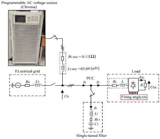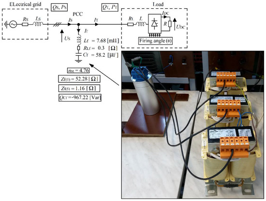 The block diagram representing the laboratory model is presented in Figure 1. It is constituted of the electrical network (grid) and the load. Before the single-tuned filter connection at the PCC, some investigations were performed at the PCC when the load was not connected and when it was connected.