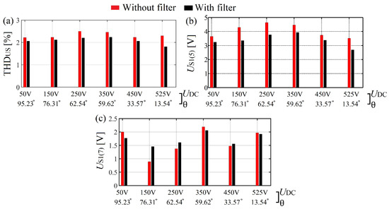 Table 6 presents some parameters of the electrical system for different rectifier firing angle values after the filter connection. It can be noticed that the grid voltage presents the highest THD (THDUS1 = 2.24%) for UDC equal to 350 V (θ = 33.57°) and the lowest THD for UDC equal to 525 V (θ = 13.54°), whereas the grid current presents the highest THD (THDIS1 = 156.09%) for UDC equal to 150 V (θ = 76.31°) and the lowest THD (THDIS1 = 36.57%) for UDC equal to 525 V (θ = 13.54°). For the rectifier firing angle θ from 0° to 13.54° and from 76.31° to 95.23°, the electrical gird is overcompensated. For θ between 26.54° and 33.57°, the electrical grid reactive power is compensated. In this case study, the better fundamental reactive power compensation (e.g., QS1(1) = 49.58 Var) is when the rectifier firing angle is around 33.57°. The single-tuned filter power losses have increased with the decrease in firing angle.