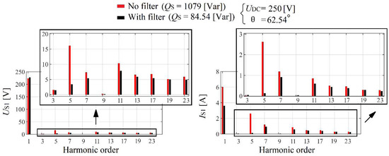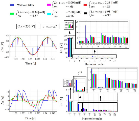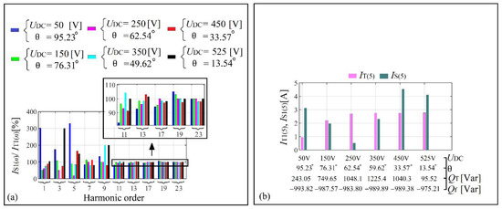 The grid voltage and current waveforms together with spectrums after the 5th harmonic filter connection are shown in Figure 17. The waveforms and spectrums of the rectifier input current and the filter current are presented in Figure 18. The grid current spectrum in Figure 17 shows that the lowest amplitude of the 5th harmonic is obtained for UDC equal to 250V (θ = 62.54°) when the filter reactive power 966.6 Var is around the load reactive power 1048.1 Var. The filter current is more charged by the 5th harmonic than the other harmonics (see the spectrum of IT1 in Figure 18).
