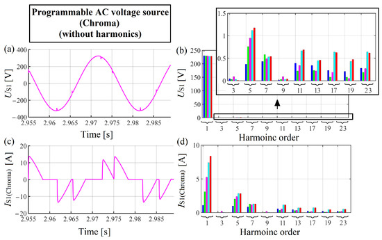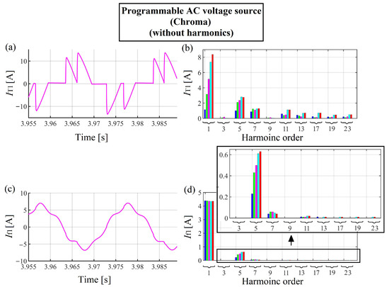 The RMS values of the grid voltage and current 5th harmonic measured in the laboratory (Figure 9a,c) are different from those of the simulation (Figure 9b,d) because, before the rectifier connection, the laboratory PCC voltage contained already the 5th harmonic (see spectrum Figure 3b). The same phenomenon is observed for the 7th harmonic (see Figure 10).
