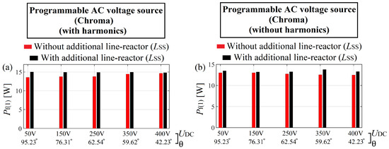 In this particular case study, it is important to notice the firing angle to which the maximum or minimum fundamental harmonic reactive or active power is achieved. The PCC active and reactive powers (fundamental harmonic) versus rectifier firing angle and versus rectifier DC voltage are shown in Figure 11a (laboratory) and Figure 11b (simulation). The active power decreases with the firing angle increase and increases with UDC increase (Figure 11a). The reactive power characteristic has achieved its maximum (1208 Var) for a θ equal to 50.23° and UDC equal to 345.6 V (Figure 11a).