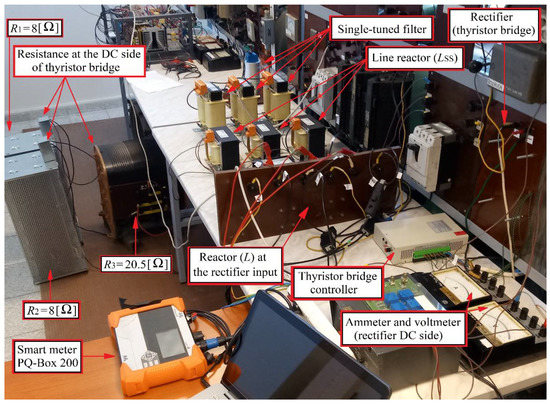 The thyristor bridge rectifier is a dynamic device from the point of view of the variability of its firing angle. Because of that, it was important to investigate (in the laboratory) the firing angle boundary values, the load minimum and maximum active and reactive powers, as well as the change of the amplitude of the harmonics (e.g., 5th, 7th, etc.) of the PCC voltage and current by increasing or decreasing the firing angle. The formula of the load characteristic harmonics order is n = (6k ± 1), where k is a natural number.