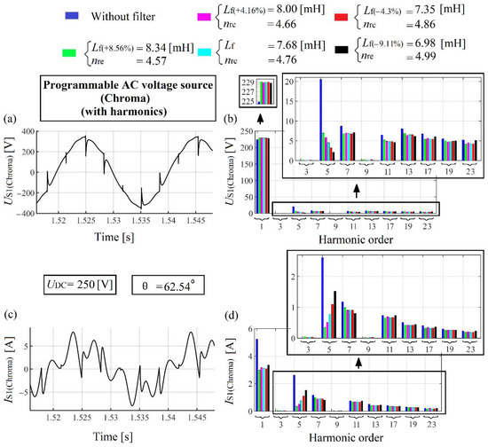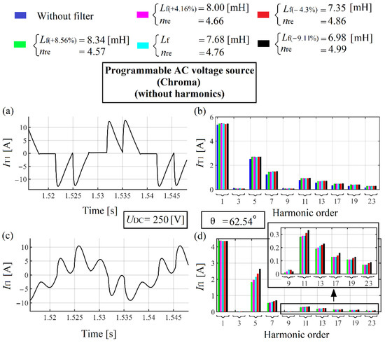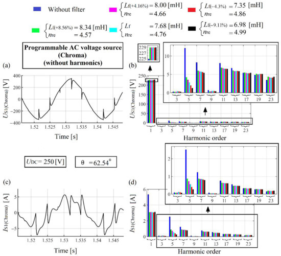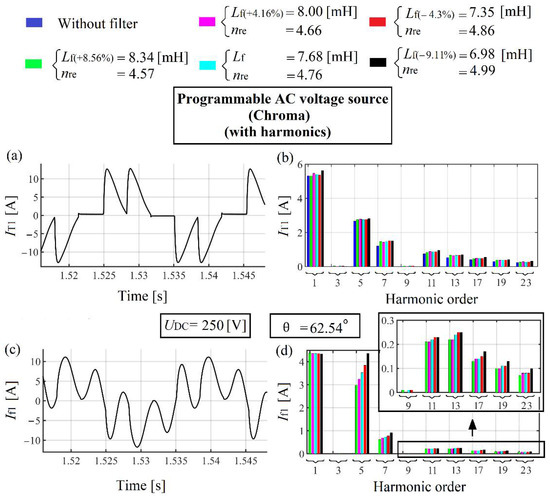 The single-tuned filter used to mitigate the grid current 5th harmonic order is tuned to the frequency (fre = 245 Hz, nre = 4.9) a bit lower than the frequency of 250 Hz (because of the aging of the filter elements). The computed parameters of the filter are presented in Table 1 (one-phase). The filter reactive power value 1000 Var was chosen to investigate in the laboratory the non-compensation, compensation, and over-compensation mode of the power system after the change of the rectifier firing angle.