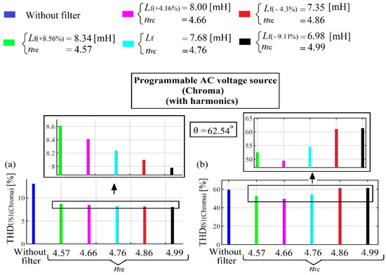 The computed filter parameters (Lf, Cf∆) in the laboratory are shown in Table 3. It can be noticed that these parameters are a little bit different from the ones of the manufacturer but are within the manufacturer’s tolerances (±10% for the reactors and −5% to 10% for the capacitor (see Table 2).