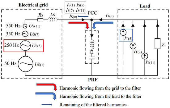 In most cases, the PHFs are applied in the electrical system in order to mitigate harmonics and reactive power. The consequences of the reactive power generated in the electrical system can be the system instability, which can affect the voltage and current level, the change of the system power losses, which may increase, etc. [50,51,52]. The harmonic sources in the power system can be organized into three important groups such as presented in [53]: saturated core devices (e.g., transformers, motors, generators, etc.); arc devices (e.g., arc furnaces devices, welding devices, gas-discharge lamp, etc.), and electronic or power electronic devices. The harmonics, if not mitigated in the electrical system, can cause: the increase in voltage and current true RMS, the overloading, overheating, and even damage of electrical system elements (e.g., transformers, generators, cables, electric motors, capacitors, etc.) and other connected devices, the reduction in a device’s life span, the perturbation of the devices normal operation and increase in operating costs, the inaccurate measurements of energy and power and the decrease in power factor (PF), etc. [54,55,56,57,58].