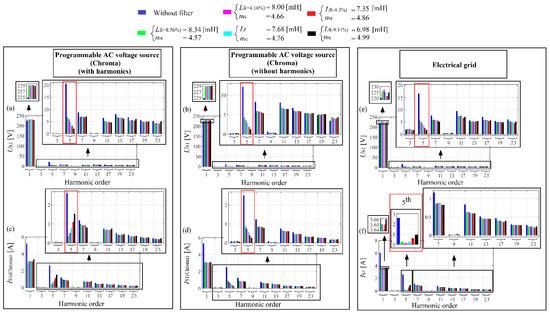 Summary comparison graphs presenting the behavior of the 5th harmonic in the voltage spectrums (a,b,e) as well as in the current spectrums (c,d,f) during the filter detuning phenomena. In the case of the supply voltage without harmonics (Chroma), the amplitude of the 5th harmonic in the voltage spectrum is reduced in the same way as in the current spectrum. The graphs are well described in the text.