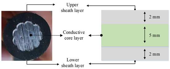 For cable fires, the local sharp temperature rise caused by its own short circuit, excessive load and other reasons causes the decomposition, degradation and combustion of the cable sheath, which aggravates the temperature rise in a cable and cause a fire. Generally, a cable is composed of a sheath layer and a conductive core layer, as shown in Figure 1. In experiments using a cone calorimeter, the cable is generally divided into three layers: the upper sheath layer, core layer and lower sheath layer. The physical parameters of the cable in this experiment were as follows: the cable diameter was 9 mm, the thickness of the sheath layer was 2 mm and the thickness of the conductive core layer was 5 mm.