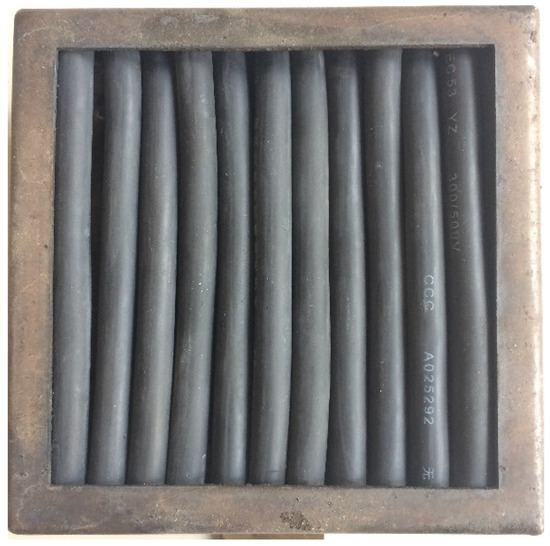 The experiments were based on the ISO 5660 standard [8]. Three different radiation intensities [22] (20 kW/m2, 30 kW/m2 and 40 kW/m2) were set up to carry out radiation ignition experiments on XLPE. In order to reflect the repeatability of the experiments and eliminate the influence of environmental factors, three repeated experiments were carried out under each radiation intensity. XLPE cables with a diameter of 9 mm were processed into cable segments with lengths of 10 mm. Eleven cables were closely arranged in a tray, as shown in Figure 2. All experimental conditions are summarized in Table 1.