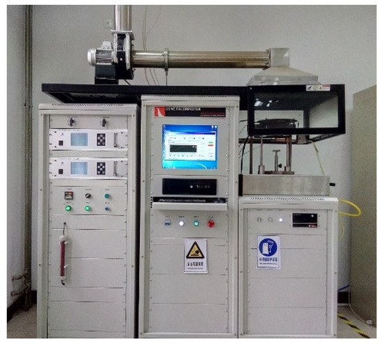 A cone calorimeter, a piece of radiation ignition experimental equipment, is composed of a radiation ignition platform, gas analyzer and computer processor, as shown in Figure 3 [2,23]. The radiation ignition platform mainly consists of a heating radiation cone, weighing equipment, a smoke-collecting hood, igniter and a heat flow meter. The radiation heat flux intensity of a radiation cone is calibrated by a heat flux meter. After a sample receives the uniform heat flux of the radiation cone to decompose the combustible gas, the spark ignition igniter is used to ignite the sample. The weighing equipment can record the mass change of the sample in the combustion process. The smoke-collecting hood is used to collect the smoke generated. The gas analyzer can analyze the volume fraction of each type of gas in the smoke through the sensor set in the exhaust duct and calculate the HRR of materials after combustion by using the oxygen content in the smoke. A computer processor is used to control the operation of the equipment and the storage and processing of the experimental data.