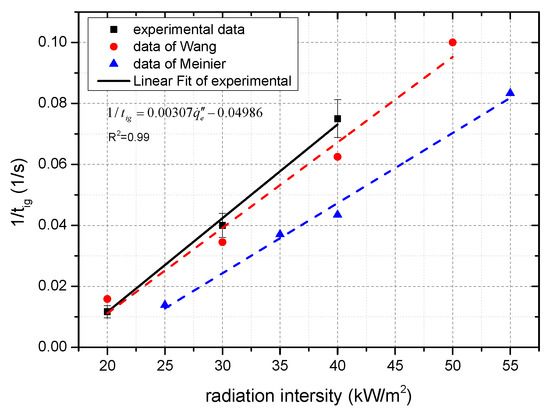 The CHF of XLPE can be estimated roughly by ignition time according to the theoretical basis. According to Formula (5), the scatter plot is drawn with the reciprocal of ignition time as the ordinate and the external heat flux as the abscissa. Then, the curve shown in Figure 4 is obtained by linear fitting. The external heat flux of material is CHF when the ignition time is infinite (). The intersection of the fitting line and the abscissa on the scatter plot is CHF. The slope of the fitting line is the reciprocal of the thermal reaction parameters (1/TRP). The linear fitting formula of the average ignition time of XLPE under three different external radiation intensities is given in the figure. The correlation coefficient of fitting line is 0.99. The calculated values of CHF and TRP are 16.24 kW/m2 and 325.7 kW·s1/2/m2, respectively. The vertical error bars for this set of the data indicate the range of levels in the three tests, which are not more than 9.8%. The figure compares the radiation ignition time relationship data of Wang [12] and Meinier’s [14] for PVC cables. It can be seen from the figure that the slope of the XLPE cable is higher than that of the PVC cable, indicating that the XLPE cable is better than the PVC cable in terms of fire resistance.