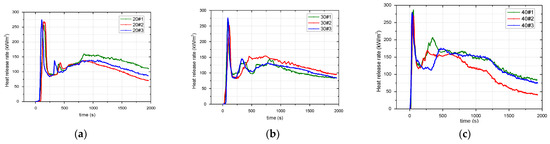 HRR curves of XLPE cables under different radiation intensities. (a) 20 kW/m2, (b) 30 kW/m2, (c) 40 kW/m2.