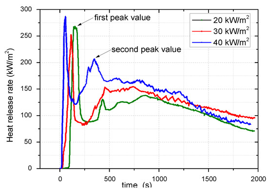 By comparing the HRR curves of XLPE (shown in Figure 6) under three different radiation intensities, the following conclusions can be obtained: