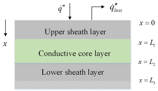 Figure 7 shows the simplified model of the cable under the cone calorimeter condition. The cable test sample is divided into the following three areas [12,27]: (1) upper sheath layer ; (2) conductive core layer ; (3) lower sheath layer .