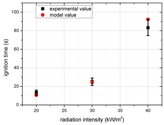 Figure 8 shows the comparison between experimental ignition time and model calculation time under various working conditions. It can be seen from the table that under high heat flux, the cable surface temperature rises rapidly, and the ignition time is very short. When the surface temperature reaches the ignition temperature, the heat has not been or only a small amount has been transferred to the core layer, so the ignition time of the model is lower than that of the experiment. At low heat flux, the heat is transmitted to the core layer through the sheath layer, and the surface temperature rises more and more slowly, which makes the ignition time of the model longer than the experimental time. However, the calculated results of the model basically match the experimental results. The mean absolute percentage error between the model value and the experimental average value is 11.17%.