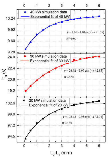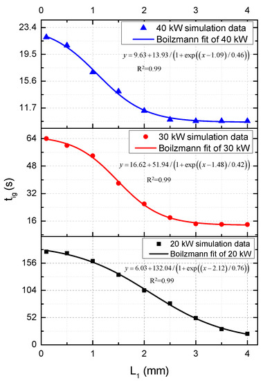 Based on the model, the radiation ignition time curve, with the thickness of the sheath layer and conductive core layer as variables, is further deduced. Figure 9 shows the ignition time variation curve of the thickness of the sheath layer ranging from 0.1 mm to 4 mm (the thickness of the core layer is 5 mm). It can be seen from the figure that when the sheath layer is very thin, the cable is mainly composed of the conductive core layer. The heat conductivity of metal is very high, so the surface temperature rises slowly, and the ignition time is relatively long. When the sheath layer thickens gradually, the temperature gradient in the sheath layer increases gradually, so the ignition time decreases gradually. When the thickness of the sheath layer increases to a certain extent, the heat has not been transmitted to the conductive core layer at the time of cable ignition, so the ignition time remains a fixed value and is no longer related to the thickness. By fitting the data, it is found that there is a Boltzmann function relationship between ignition time and sheath thickness. The data-fitting formula is given in the figure, and R2 is greater than 0.99.