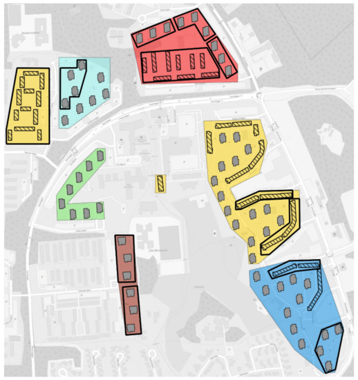 Multi-family buildings in the Sätra district. Square grey buildings are tower buildings and elongated striped buildings are low-rise buildings. Clusters have been colourized based on property owners. Map scale 1:5000. Map was created using QGIS.