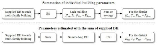 Table 1 shows the difference of using the sum of individual building ES parameters against determining parameters with the summed-up DH demand. The most significant difference is in prediction of Tb for tower buildings and all multi-family buildings. The difference is likely due to a relatively large difference in Tb between individual buildings, and due to Tb being calculated as average.