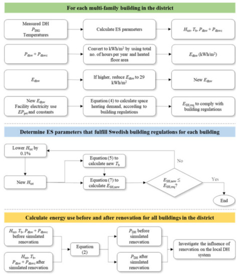 Figure 4 shows an overview of the simulated renovation method used in this paper. The methodology is based on calculating ES parameters, using input values explained in Section 3.1. These parameters along with the primary energy use number (EPpet) are then used to simulate renovation on the buildings’ base load demand as well as their space heating demand. This is explained below Figure 4.