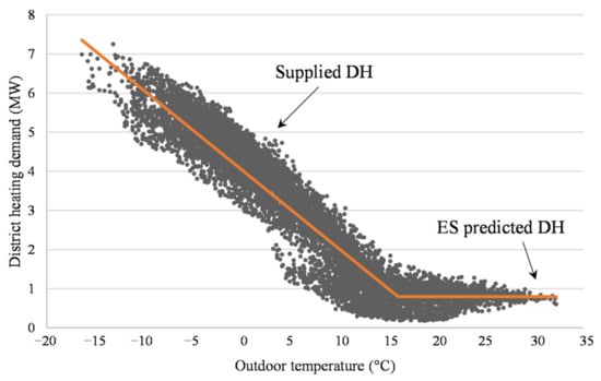 Figure 6 shows DH demand according to supplied (measured) values to the total district multi-family building stock, in dark grey circles, while the orange line shows DH demand predicted by the ES method. Both are fitted to outdoor temperature in 2018. Predicted DH demand was in this case determined with ES parameters based on summed supplied DH (bottom row of Table 1). Figure 6 shows that the ES method determines a value for Htot that is roughly average of the supplied DH demand, below Tb. The same applies to base load of the district building stock, above Tb. The total annual supplied district DH demand was roughly 24.7 GWh, and the predicted value by ES was essentially the same, as displayed in Table 1.