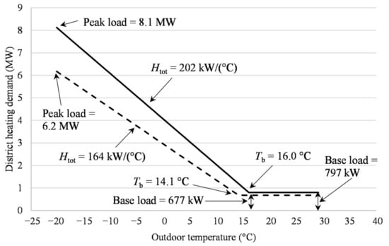 As mentioned, building base load is made up of DHW and DHWC losses. For DHW losses, the Swedish building energy performance regulation was used as a reference value [53], corresponding to 25 kWh/(m2∙year). Additionally, DHWC losses were assumed to be 4 kWh/(m2∙year), according to Swedish standard value for newly constructed multi-family buildings [54]. The total reference base load is then 29 kWh/(m2∙year). If the base load of a building was higher than this, its base load was reduced to 29 kWh/(m2∙year).