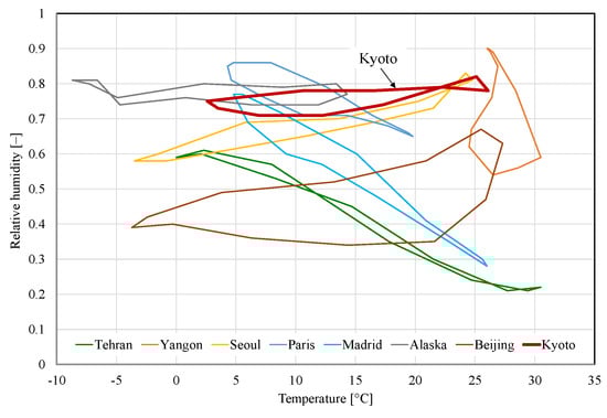 As Japan has four seasons, summer cooling and winter heating are generally required. Thus, energy-saving measures and building design must consider these seasonal requirements, which differ from those in other countries. Climographs of the major cities of several countries are shown in Figure 1 [18]. High relative humidity throughout the year is a notable feature of Kyoto, which causes a muggy environment in summer.