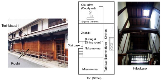 The target of our project is Kyo-machiya, which is a wooden detached house or a townhouse-type residential building built before 1950 by “traditional wooden post and beam construction” or “traditional construction”. It was defined by the ordinance of Kyoto City in 2017 [19] and has all or several of the following features (Figure 2): Tori-niwa (a thin and long earth floor running from the entrance, which faces the road, to the courtyard), Tsubo-niwa or Oku-niwa (a small courtyard), Tori-bisashi (eaves installed along the roadside), and Koshi (types of windows, such as Mushiko-mado or Kyo-goushi). The upper part of the Tori-niwa is an atrium called the Hibukuro, whose original purpose was to discharge smoke and soot generated by the burning of wood during cooking.