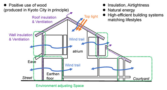 There are several issues concerning Kyo-machiya, especially as traditional residences are demolished and replaced with high-rise flats. For example, the preservation and inheritance of Kyo-machiya has become important because of their relevance as homes, cultural heritage, and tourist attractions. Additionally, the conservation of forests surrounding Kyoto City is also an area of concern. To address these issues, Kyoto City held a civic meeting in 2008: “Kyoto, a city taking care of wood culture.” The civic meeting adopted “Heisei-no-Kyo-machiya” as one of the main themes to be discussed. “Heisei-no-Kyo-machiya” is a new residence model, designed based on tradition and associated knowledge of the Kyo-machiya, while also integrating the most advanced environmental technology. Figure 3 shows the concept of a “Heisei-no-Kyo-machiya”, whose cross-sectional features are almost the same as those of a conventional Kyo-machiya: effective wind trail, partial use of earthen floor, and small attached courtyards. The largest difference between them is the thermal insulation performance and airtightness. Based on the report of the civic meeting released in 2010, Kyoto City has taken measures [27] to advance the construction of “Heisei-no-Kyo-machiya”.