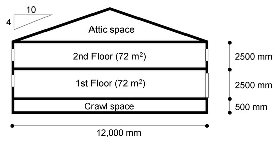 The air exchange rate was set to 10 [1/h] during naturally ventilation and 0.5 [1/h] during no ventilation. It is assumed that the residents principally inhabit the first floor, whereas the second floor comprises a storage space and a space used only to lodge temporary visitors for a few days.