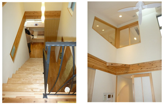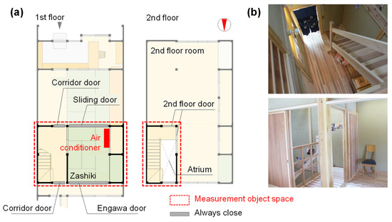 The temperature and airflow distributions in the staircase of a model residence (Figure 7) were measured in winter to analyze the characteristics of cold draft occurring in the atrium. When the Zashiki on the first floor was air-conditioned at 25 °C, the door (Fusuma) connected to the staircase was kept open. The effect of opening or closing the door on the second floor was also examined.